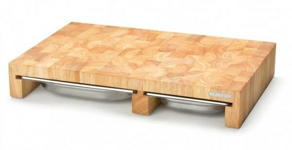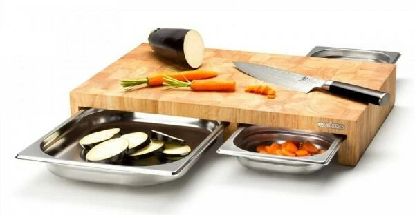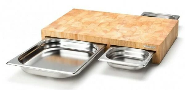 Continenta Schneidebrett aus Gummibaum Stirnholz mit 3 Schubladen. Das hochwertige Multifunktionsbrett bestehend aus einer großen und zwei kleinen Auffangschalen aus Edelstahl.