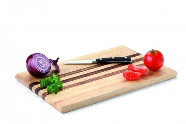 Schneidebrett aus Gummibaumholz mit Streifen aus Akazienholz. Außergewöhnlicher Look gepaart mit besten Schneideeigenschaften.