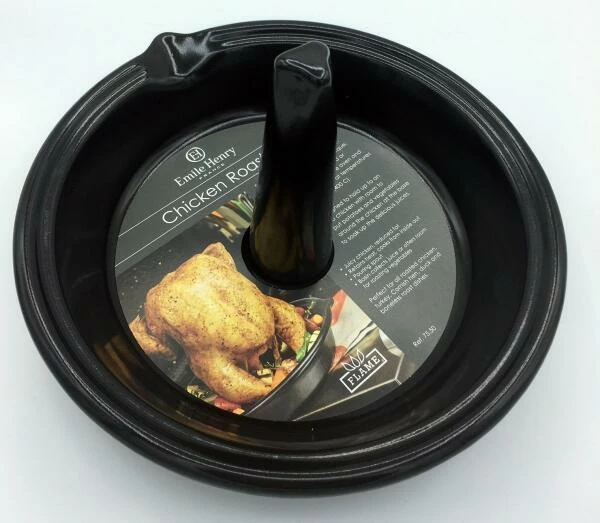 Emile Henry Hähnchenbräter rund in fusain. Ideal zum Braten von Hähnchen, Puten und Enten. Durch das aufrechte Braten im Backofen wird die Geflügelhaut außen schön braun und knusprig.