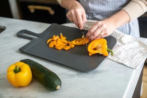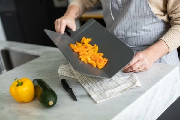 Das faltbare Schneidebrett SNAP ist dank abgeschrägtem Rand leicht anzuheben und durch das Material klingenschonend sowie 100% CO2-neutral. Die Bretter sind spülmaschinengeeignet und frei von BPA und Melamin.