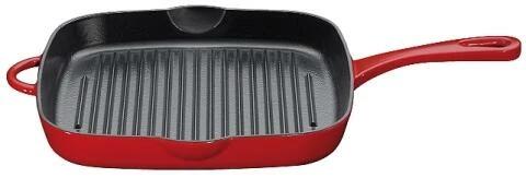 Küchenprofi Grillpfanne aus Gusseisen in rot mit hohem Rand. In der Grillpfanne wird das Grillgut im eigen Saft mit wenig Fett gebraten.