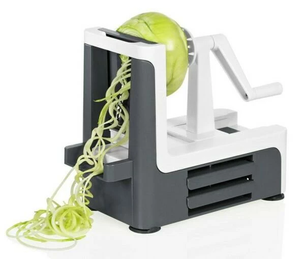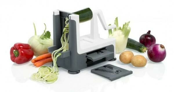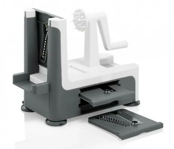 Klassisch kommt der Spiralschneider, wie sein Vorgänger, der Spirali, mit drei Klingen daher: Die feine (1mm) sowie die mittlere (3mm) Spaghetti-Klinge und die fest stehende Spiralklinge. Mit dem Spiralschneider zaubern Sie veblüffend einfach dünne Spiralen oder Spaghetti im Handumdrehen und bereiten damit gesunde Leckerbissen mit toller Optik wie aus der Gourmetküche zu. Obst und Gemüse mal anders: Kreative Rohkostsalate, Spiralen zum Kochen oder Braten sowie Variationen als Dekoration veblüffend einfach und mit toller Optik. Extrem scharfe Klingen aus hochwertigem Edelstahl sicher aufbewahrt in den cleveren Seitenfächern.