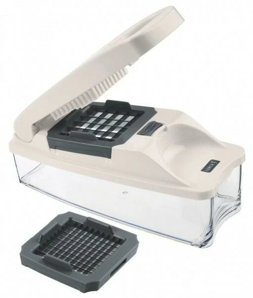 Mit dem Würfel- und Stifteschneider von Lurch können Sie Gemüse oder Obst mit nur wenigen Handgriffen, geringem Kraftaufwand blitzschnell und gleichmäßig würfeln. Er bietet zwei extra scharfe Klingeneinsätze für grobe und feine Würfel beziehungsweise Streifen. Der großflächige Schneiddrücker sorgt für sicheres Arbeiten. Der große Auffangbehälter mit einem Fassungsvermögen von max. 1 Liter, fängt ihr in Würfel bzw. Stifte geschnittenes Schneidgut sicher auf.