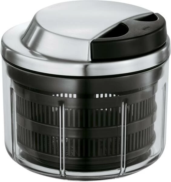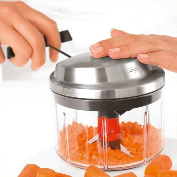 RÖSLE: Ob knackige Möhren, weiches Obst oder Kräuter – mit nur einem Zug machen die zwei Edelstahl-Klingen Großes klein und Grobes fein. Dank des komplett geschlossenen Behälters lassen sich auch scharfe Zwiebeln & Co. im nu ohne Tränen verarbeiten. Die Versteifungsrippen im Behälter sowie der Ab- und Aufweiser am Rotor garantieren eine gleichmäßige Verteilung des Inhalts in der Schüssel und sorgen so für ein optimales Schneideergebnis. Die Rutschsicherung am Boden und der ergonomische Griff ermöglichen ein sicheres Arbeiten.