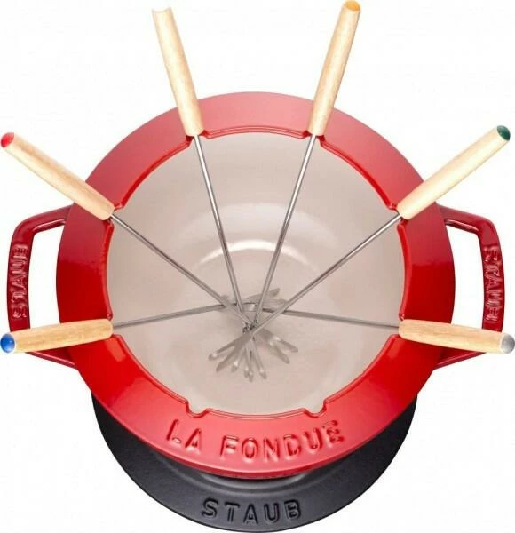 Staub Fondueset aus Gusseisen kirschrot. Fonduetöpfe aus Gusseisen speichern Hitze ideal und halten das Fett oder die Brühe besonders lange heiß – bei Tisch, wenn Sie mit Freunden das Fondue zelebrieren.