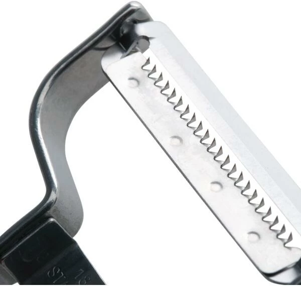 Julienneschneider “extra fein” zum Schneiden von besonders feinen, nur 1,5 mm dicken Streifen aus Gemüse.Für die kreative und festliche Küche. Der Julienneschneider wird wie ein Sparschäler verwendet und schneidet haarfeine Gemüsespaghetti, Garnituren, Gemüsenester oder perfekte Suppeneinlagen. Der Kreativität sind keine Grenzen gesetzt. Er ist komplett aus hochwertigem Edelstahl gefertigt und hat eine gehärtete Klinge aus rostfreiem Spezialstahl für lang anhaltende Schärfe. Rostfrei und spülmaschinengeeignet.