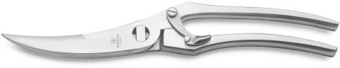 Die leicht gebogenen und scharfen Edelstahlklingen eignen sich ideal zum Enthäuten, Schneiden und Zerlegen von Geflügel. Eine innenliegende Feder zwischen den Scherenbacken und stabile Griffe sorgen für ein ermüdungsfreies Arbeiten.